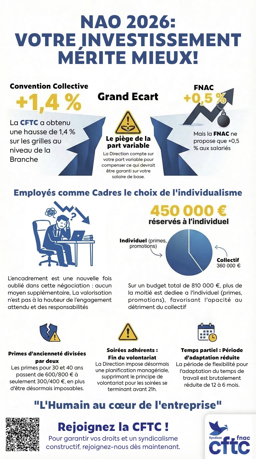 Les Négociations Annuelles Obligatoires (NAO) 2026 viennent de révéler une baisse scandaleuse de 42 % du budget alloué aux salariés : 1 400 000 € en 2025 → 810 000 € en 2026 : une réduction inacceptable qui menace vos salaires, vos primes et vos conditions de travail. Pire encore: la Direction a dénoncé … En savoir +